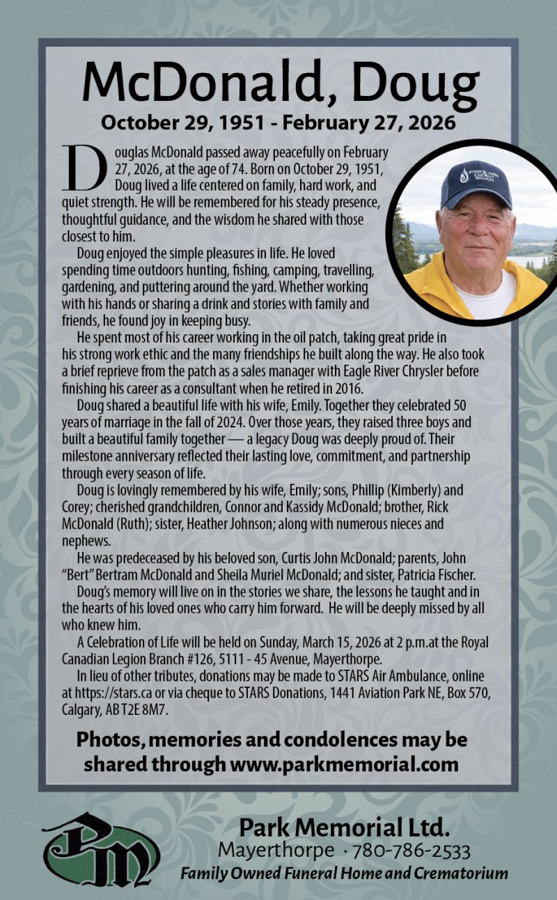 Obituaries Doug McDonald Whitecourt Press March 10, 2026 Continue Reading Previous Edith Rose Johnston More Stories Obituaries Edith Rose Johnston February 18, 2026 Whitecourt Press